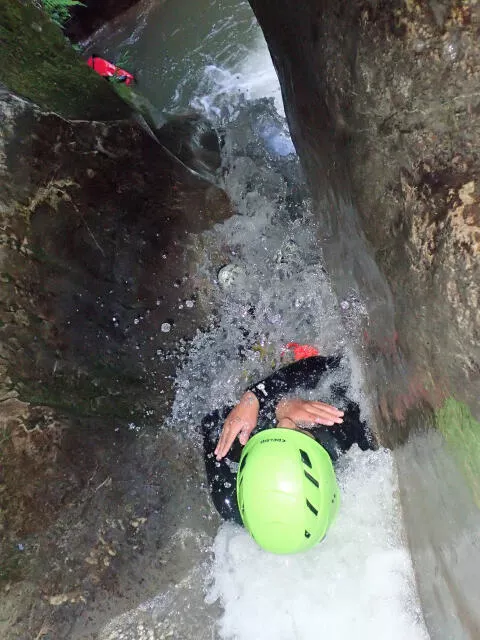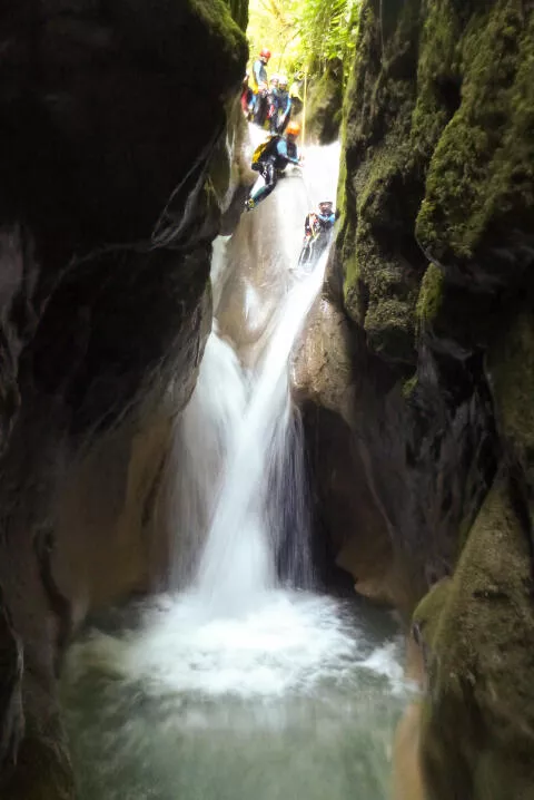 Near Lake Aiguebelette, this classic canyon in Savoie is located at the gateway of the Chartreuse massif. It takes a bit more than half a day: slides, jumps - not compulsory, but enjoying the small ones is recommended as the course offers a lot of them. There are a few short passages on ropes, alterning with walking sections. It is a route that extends over a fairly long distance: it will come in handy to organize a car shuttle to cut down the initial walk.