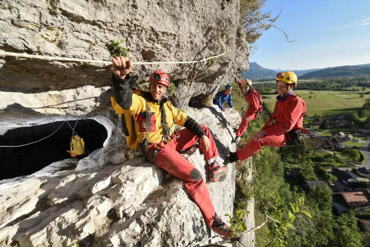 Une courte marche d'approche, suivie d'un passage sur vire nécessitant l'usage du baudrier, avec les longes de sécurité, et nous voilà à pieds d'oeuvre pour cette exploration aux dimensions humaines !