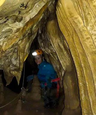 Quelques cordes, dont deux descentes en rappel de 5 mètres, des passages ludiques et aquatiques, nous permettront de trouver le cours d'eau souterrain, ponctué de belles concrétions.