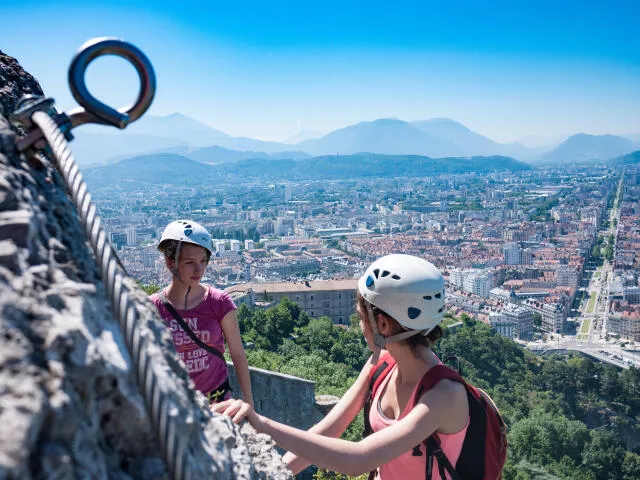 A Grenoble, on peut pratiquer la via-ferrata en ville ! La Bastille surplombe Grenoble et offre de magnifiques vues sur la capitale des Alpes. Une particularité : elle est accessible depuis le centre-ville, sans moyen de transport : la première partie est idéale pour l’initiation, avec un pont de singe et une passerelle tous deux mémorables, la seconde partie est plus physique mais comporte des échappatoires.