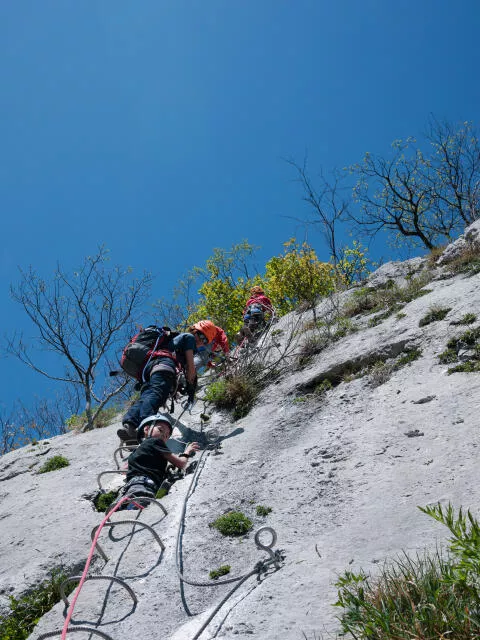 L'aménagement du parcours rend celui-ci très facile et adapté aux enfants et adultes débutants, mais l'aspect aérien n'est pas à négliger pour autant car, dès les premiers échelons, le voyage commence ! Une fois la hauteur apprivoisée, que de plaisirs verticaux s'offrent à vous : vue imprenable sur le lac du Bourget, les Bauges et Belledonne avec ses faces nord souvent encore enneigées. A prendre en compte : marche d'approche d'environ 30 minutes, en montée.
