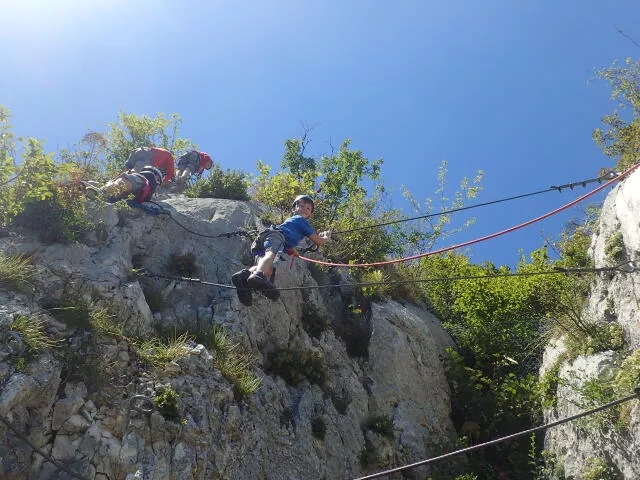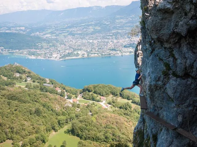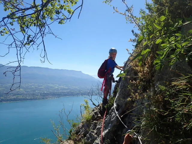 L'aménagement du parcours rend celui-ci très facile et adapté aux enfants et adultes débutants, mais l'aspect aérien n'est pas à négliger pour autant car, dès les premiers échelons, le voyage commence ! Une fois la hauteur apprivoisée, que de plaisirs verticaux s'offrent à vous : vue imprenable sur le lac du Bourget, les Bauges et Belledonne avec ses faces nord souvent encore enneigées. A prendre en compte : marche d'approche d'environ 30 minutes, en montée.